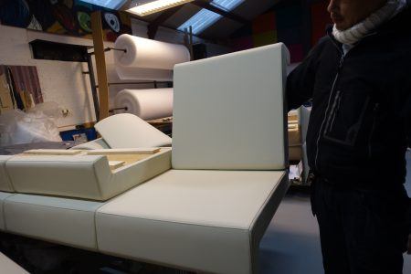 Voor in de ICT fabriek van de ABN AMRO hebben wij een heel zit element in een U-vorm mogen stofferen bestaande uit 22 delen. In dit geval hebben we gebruik gemaakt van hoge kwaliteit skai.