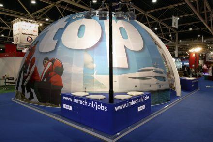 Voor Verkerk hebben wij een mooie dome gemaakt. De stof is over een bestaande metalen constructie gestoffeerd. De dome is meerdere malen te gebruiken.